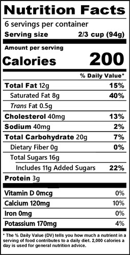 WATER, ANHYDROUS MILK FAT, SKIM MILK POWDER, SUGAR, CORN SYRUP SOLIDS, PASTEURIZED EGGS, NATURAL & ARTIFICIAL FLAVOURS, STABILIZER/EMULSIFIER (MONO- AND DIGLYCERIDES, GUAR GUM, CELLULOSE GUM & CARRAGEENAN STANDARDIZED WITH DEXTROSE).