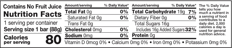 WATER, SUGAR, CORN SYRUP SOLIDS, NATURAL & ARTIFICIAL FLAVOUR, CITRIC ACID, STABILIZER (CELLULOSE GUM, XANTHAN GUM, STANDARDIZED WITH DEXTROSE), ARTIFICIAL COLOURS (FD&C YELLOW 6 AND AMARANTH RED).