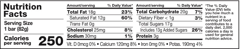 ICE CREAM (WATER, ANHYDROUS MILK FAT, SKIM MILK POWDER, SUGAR, CORN SYRUP SOLIDS, ARTIFICIAL FLAVOUR, STABILIZER/EMULSIFIER (MONO- AND DIGLYCERIDES, GUAR GUM, CELLULOSE GUM & CARRAGEENAN STANDARDIZED WITH DEXTROSE). CHOCOLATE COATING (COCOA MASS, SUGAR, COCOA BUTTER, COCONUT OIL, MILK FAT, EMULSIFIER (SOY LECITHIN), NATURAL FLAVOUR).